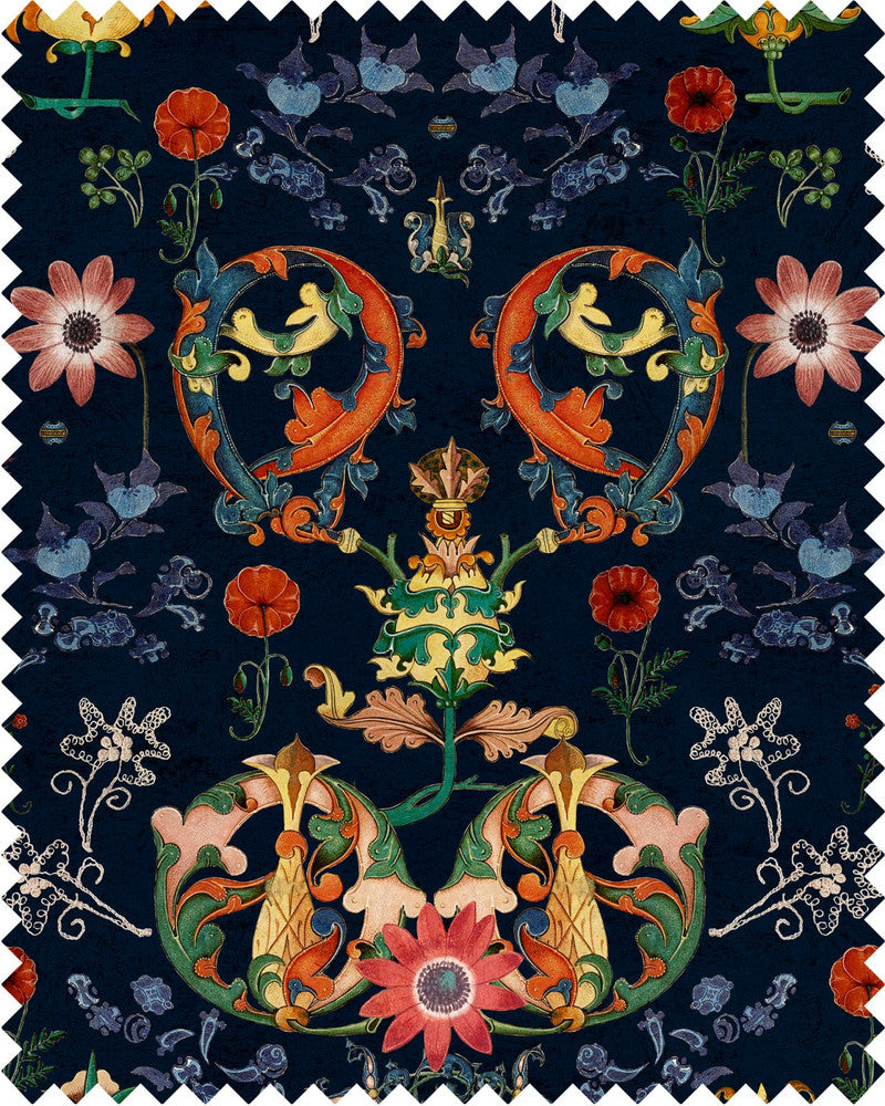 A unique design with powerful floral elements, on a deep blue background, inspired from the beautiful Transylvanian folk and culture.